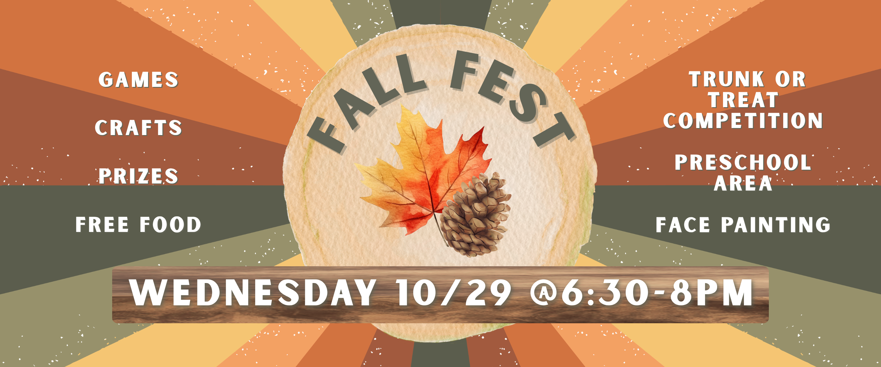Join us for a super fun fall festival! We have activities and games for kids of all ages, a trunk-or-treat competition, hot dogs, face-painting, and all kinds of other fall fun!